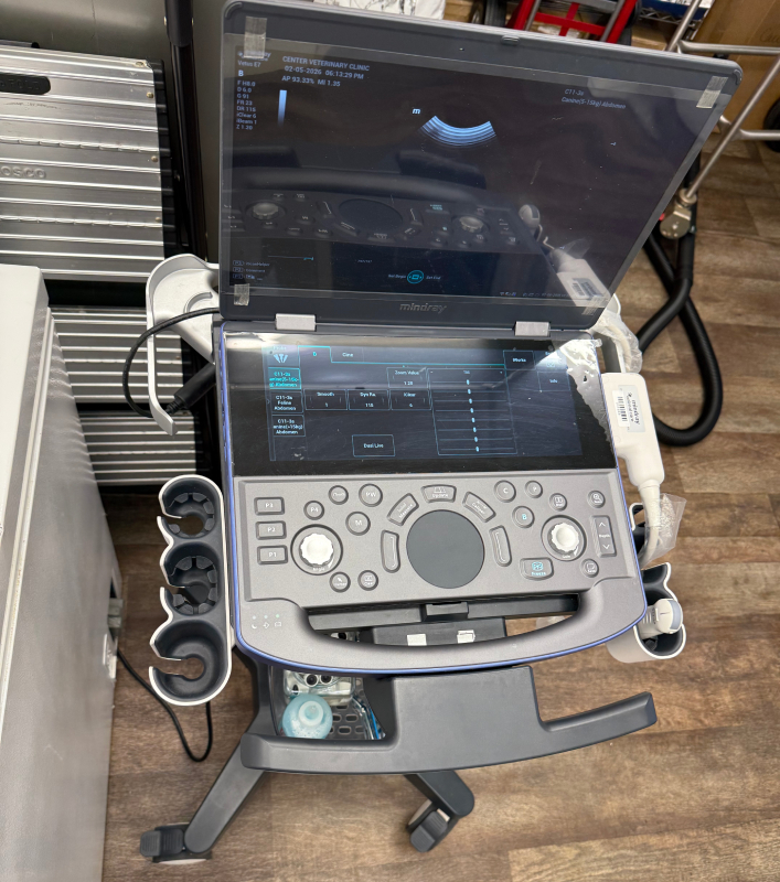 During an ultrasound, high-frequency sound waves capture images of pets’ internal structures. The equipment includes the main ultrasound machine as well as a smaller handheld device. The ultrasound machine emits sound waves, and the handheld device delivers those waves to the patient’s body. The waves bounce off of internal structures, like organs, and return to a sensor in the machine. The machine uses these echoes to instantly produce images we can view on a screen.